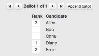 Second, you can send a paper ballot to each postal voter, receive the paper ballot back, and then enter the postal ballot yourself using the assigned code. You simply go the election website, enter the voter's code, and then enter the vote on behalf of the postal voter. Note that you need to trust the person entering ballots this way not to cheat! Because ballots are anonymous after they have been entered, there is no way to later determine whether the ballot was entered correctly. For this reason, we prefer the Election then Count method above.