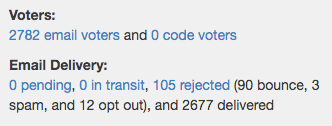 The last category is delivered emails. Nearly all of the time, this means the voting email reached the voter's inbox. We can't be sure however. All we really know is that the mail server told us that it accepted the email. The email could have been put in the voter's spam folder or could have been lost on the receiving end.So there you have it. We hope you find this feature useful!