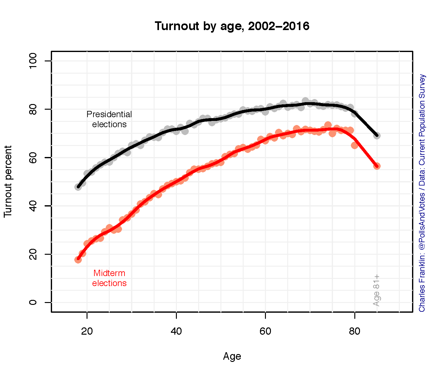 The above graph shows voter turnout by age. The correlation between age and voter turnout is remarkable. Not only do younger people vote less than older people, but there is a continual decline in voter turnout as voters get younger. 18 year olds vote less often than 20 year olds who vote less often than 22 year olds, and so forth.