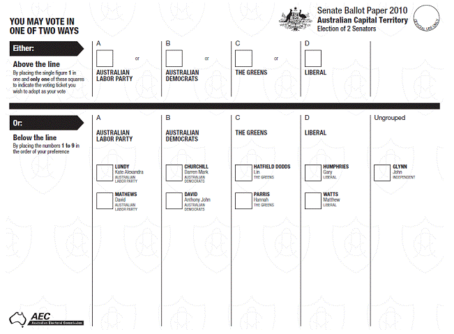 An ATL vote is to select a party of the four parties competing in the election. If a voter picks a party, then the voter's vote is determined by the party's "ticket". Before the election, each party specifies its ticket, which corresponds to a ranking of the candidates competing in the election. Each party presumably ranks it own candidates the highest and followed by candidates of ideologically similar parties.